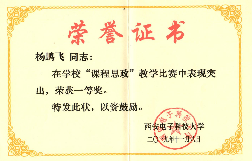 杨鹏飞老师获“2019年度课程思政教学比赛一等奖”