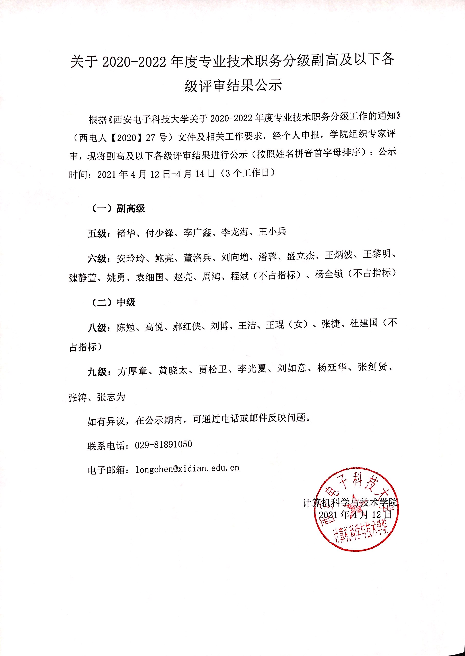 关于2020-2022年度专业技术职务分级副高及以下各级评审结果公示