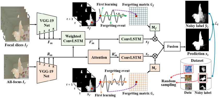 冯明涛博士长期从事复杂场景视觉感知与理解领域相关的研究工作,在学院良好科研环境支持下,所做系列工作相继发表在IEEE TIP、PR、ICCV等期刊会议,并入选2021年青年托举人才,是论文“基于像素级噪声标签的学习策略:一个光场显著性检测的新视角”(“Learning from Pixel-Level Noisy Label : A New Perspective for Light Field Saliency Detection”)的第一作者,张亮教授是该论文的通讯作者,合作者有湖南大学王耀南教授、澳大利亚西澳大学Ajmal Mian教授等,今年会官方网站是该论文的第一完成单位及通讯作者单位。该论文受人类学习过程中“学习-遗忘-再学习”的机制所启发,解析了不确定标签监督下深度网络模型训练过程中的遗忘规律,抑制不确定标签对深度网络模型训练的干扰,进而大幅度提升深度网络模型的鲁棒性和稳定性。