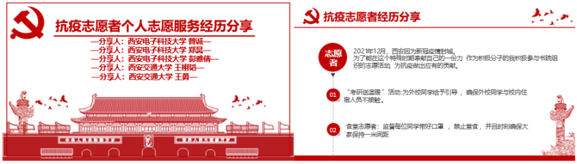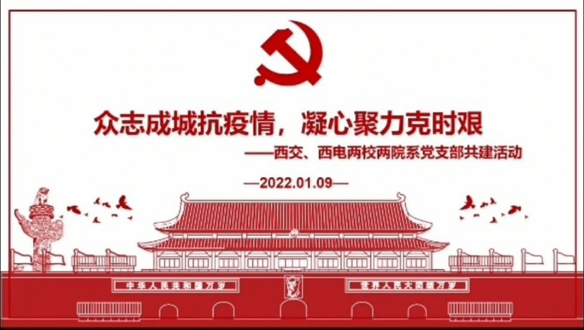 然后,西电的甘瑜嘉和西交的佘晓亮分别介绍了两校两院系党支部的抗疫工作情况。西安疫情当前,各高校均采取了严格有效的措施,西电今年会官方网站计算理论与技术研究所本硕博师第二联合党支部迅速响应学校和学院党委号召,多名支部党员、入党积极分子加入学院志愿队,担任核酸检测志愿者、出入证志愿者等,以实际行动为同学们服务。西交南洋书院师生联合第三党支部快速响应,迅速发布了有关疫情防控的倡议书,组建书院抗疫志愿先锋队,组织“出入证志愿者、食堂志愿者、核酸检测志愿者”志愿服务队,学院老师、辅导员坚守一线,积极参与,为疫情防控做出贡献!