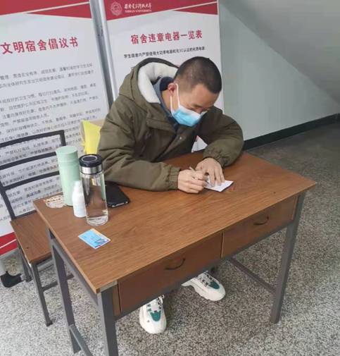 组织委员马国臣、支部党员王发林分别担任楼长、层长,牺牲自己的时间配合辅导员工作,及时通知学校的各项安排。马国臣谈到,在志愿服务的同时切实感受到了学校的关怀,发放口罩餐盒等各种物资,组织多轮核酸检测,安排错峰就餐。支部党员邸维高参与协助搬运物资,他说,这是疫情期间第一次抢到志愿者名额,能为同学们服务我很高兴,也更加了解一线抗疫人员的辛苦。在我们安稳生活的背后,总有一群人在默默地付出。