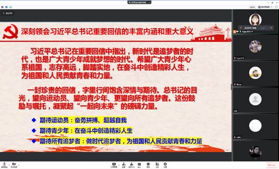 3月25日下午,今年会官方网站智能媒体与数据工程研究所本硕博师第三联合党支部组织全体党员开展“用奋勇拼搏奏响追梦乐章”主题党日活动,集体学习习近平总书记给中国冰雪健儿代表的回信内容,深受鼓舞、倍感振奋,大家纷纷表示一定牢记习近平总书记的殷切期望和谆谆教诲,认真领会习近平总书记重要回信的丰富内涵及重要意义,从拼搏奋进、永不放弃的体育精神中汲取伟大力量,坚定理想信念、磨炼坚强意志、锻炼强健体魄、勤奋上进、追求卓越,努力成为可堪大用能担重任的栋梁之才,为祖国和人民贡献青春和力量。