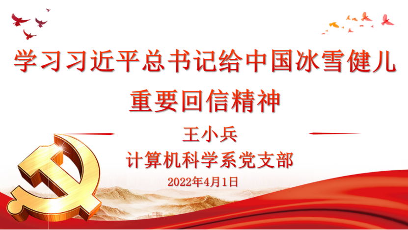 (通讯员  李晓)2022年2月4日至2月20日,面对肆虐的新冠肺炎疫情,第24届冬季奥林匹克运动会在北京成功举行,中国冰雪健儿取得了9金4银2铜的优异成绩,位于金牌榜第三,极大的振奋了民族自豪感。4月1日晚8点,计算机科学系教师党支部在线开展“学习习近平总书记给中国冰雪健儿的重要回信精神”的主题党日活动。活动由支部书记王小兵主持,共有19名支部党员参加。