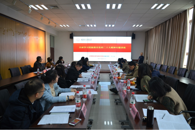 学院党委书记李青山做《全面学习把握落实党的二十大精神》专题宣讲。李青山回顾了党的十八大以来的历史脉络和新时代十年的伟大成就,深入解读了党的二十大精神的内涵和外延。聚焦与高校密切相关的“科教兴国、教育为本、人才支撑”等内容,宣讲以大量数据对比的方式,融通历史与现实、理论与实践。李青山鼓励师生以党的二十大精神为指引,立足岗位践行担当,为我国科教事业做出积极贡献。