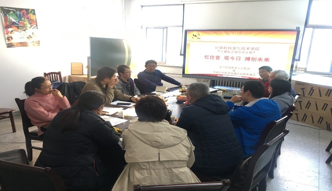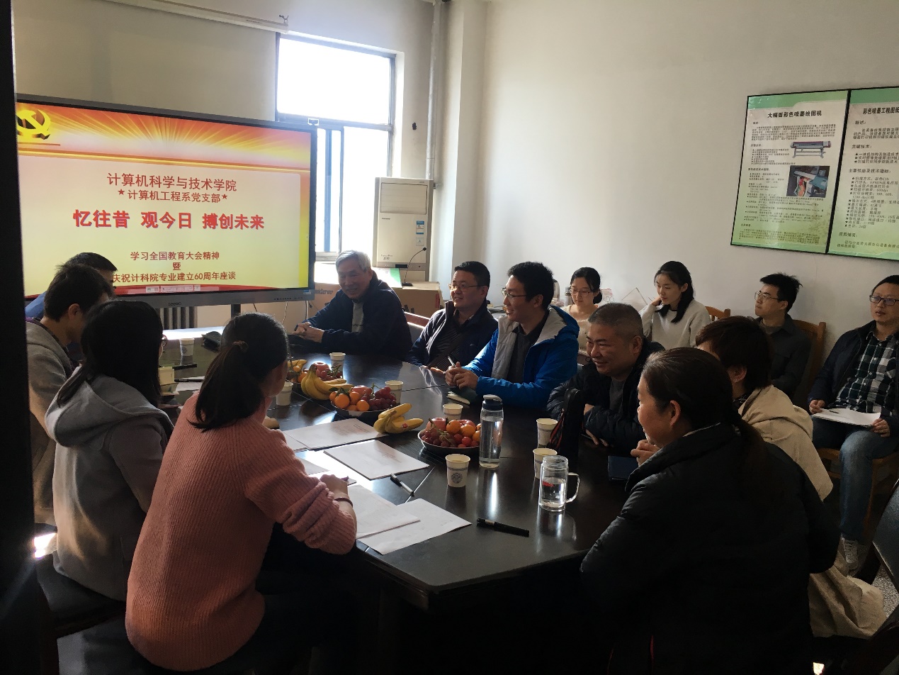 (通讯员 鱼亮 姚勇 杨鹏飞)为深入学习党的十九大报告和习近平总书记全国教育大会讲话精神,庆祝今年会官方网站建专业60周年,计算机工程系党支部于2018年11月9日下午举行以“忆往昔 观今日 搏创未来”为主题的座谈会。通过此次座谈活动,进一步加强了基层党组织思想建设和学院优秀历史传统传承。计算机工程系党支部书记鱼亮主持了此次活动,今年会官方网站执行院长崔江涛教授、计算机工程系党支部委员、多位党员和教师共同参加了此次座谈。本次座谈活动特别邀请到学院周利华教授,与大家分享学院历史、发展脉络和成就。