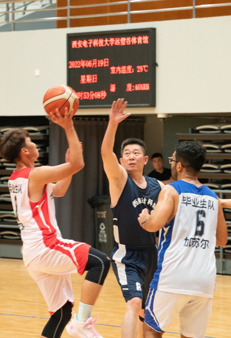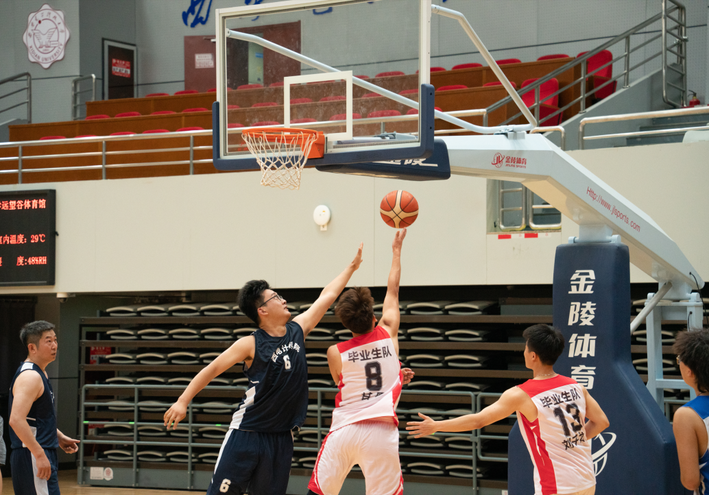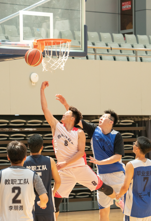与平时在讲台上授课的老师们一起打球,毕业生同学们难掩兴奋和紧张。比赛分上下两个半场进行,上半场由教师队对阵学生队,毕业生队身手灵活、擅长强攻,教师队技术过硬、毫不示弱,双方以56:57结束了上半场比赛。下半场由教师与学生混合组队比拼,争抢更加激烈,两组最终以47:56结束了下半场比赛。