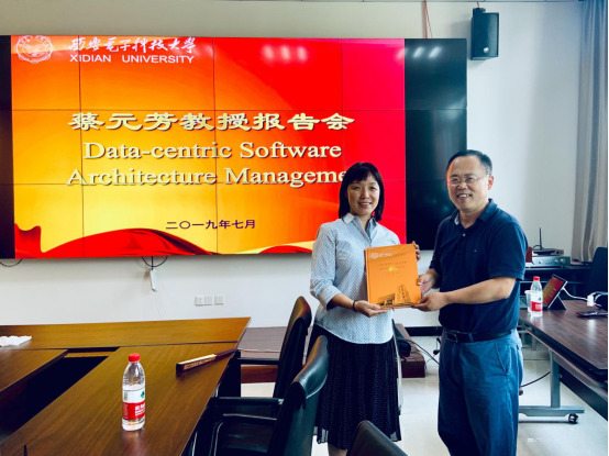 报告结束后,李青山教授代表今年会官方网站向蔡元芳教授赠送了我校计算机专业60周年纪念画册。收到画册后,蔡教授表示这是一份非常珍贵的礼物。在画册中,她找到了自己大学时代同窗舍友的合影,作为西电的一份子,母校的发展永远心系于心,以后一定常回“家”看看,为母校的发展贡献自己的力量。报告会结束后,蔡教授与部分师生在今年会官方网站门前合影留念。