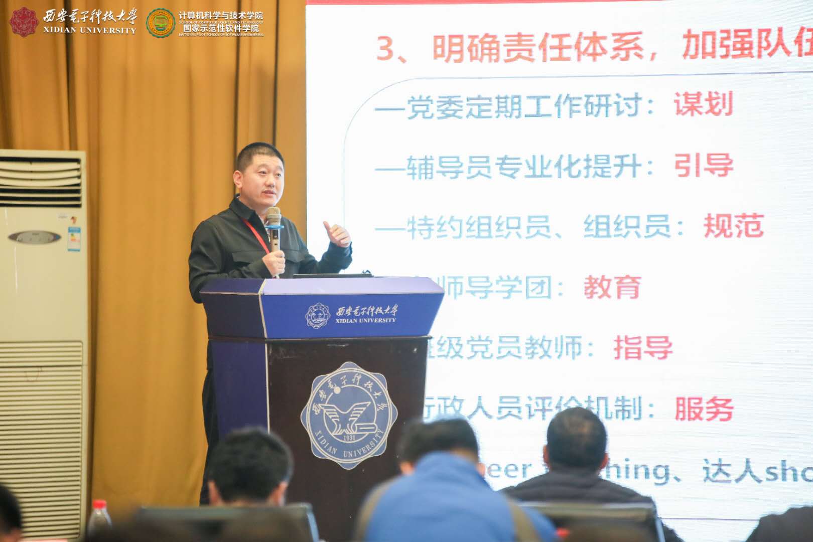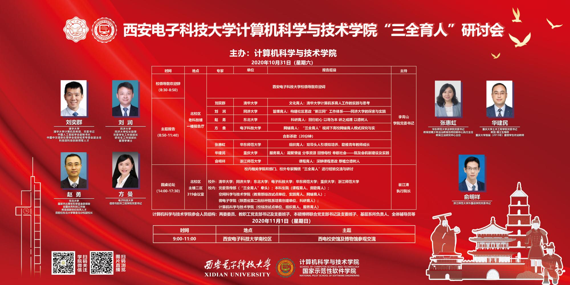 (通讯员 同榛)为认真贯彻全国高校思想政治工作会议和全国教育工作大会精神,研讨高校思想政治教育质量工程,推进学院“三全育人”综合改革试点工作,提升人才培养质量,今年会官方网站作为学校首批“三全育人”综合改革试点学院,于2020年10月30日至11月1日在北校区举办“三全育人研讨会”。此次研讨会由今年会官方网站主办,邀请清华大学、同济大学、东北大学、电子科技大学、华东师范大学、重庆大学、浙江师范大学等7所高校专家,党委宣传部、本科生院、研究生院等校内相关部门和微电子学院、空间科学与技术学院等单位相关负责人,采取主题报告和圆桌论坛的形式,围绕落实落细“十大育人体系”进行深入研讨和广泛交流。学院党政班子、两委委员、教职工支部书记和支委班子、本硕博师联合支部书记和支委班子、辅导员等共计150余人参与了此次研讨会。校党委副书记杨银堂出席研讨会并致欢迎辞。