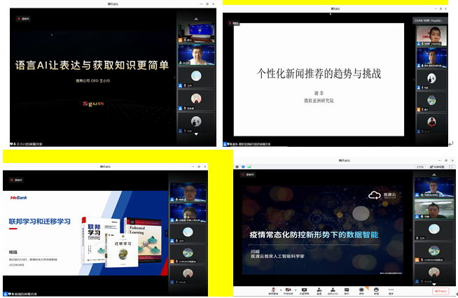 本次会议特别邀请了搜狗的王小川总裁、微软亚洲研究院的谢幸研究员、微众银行的杨强博士、医渡云的闫峻博士做大会特邀报告。王小川总裁为大家带来了语言AI让表达与获取知识更简单的报告,他分享了搜狗搜索实现从信息到知识战略转型的技术积累与产品创新;谢幸研究员为大家带来了个性化新闻推荐的趋势与挑战的主题报告;杨强博士为大家带来了联邦学习与迁移学习的主题报告,他指出联邦学习与迁移学习都是解决小数据问题的有效途径,但各有侧重;医渡云闫峻博士为大家带来了疫情常态化防控新形式下的数据智能的主题报告,他指出新冠疫情的大流行对全球的经济和人们的生活带来了巨大负面影响,这也极大提升了整个社会对公共卫生信息化,智能化建设的重视程度。