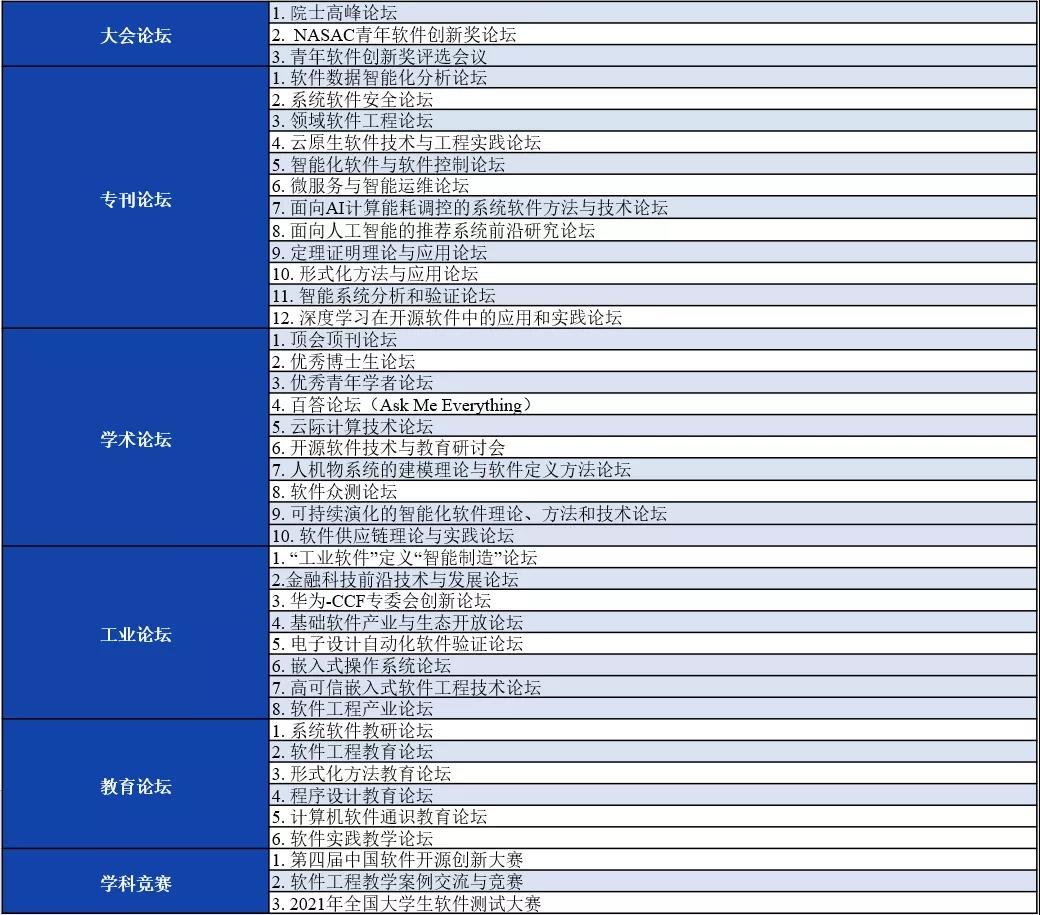 2021CCF中国软件大会将组织特邀报告、院士高峰论坛、青年学者论坛、论文专刊论坛、顶会顶刊论坛、学术论坛、工业论坛、教育论坛、学科竞赛答辩和软件研究成果展示等30余个不同类型的活动。大会将邀请10余位软件及相关领域中国科学院院士与中国工程院院士,为大会带来特邀报告并参加院士高峰论坛等活动。目前已邀请参会的两院院士包括中国科学院院士林惠民,中国科学院院士陶文铨,中国科学院院士梅宏,中国科学院院士吕建,中国科学院院士李应红,中国工程院院士廖湘科,中国科学院院士杨孟飞,中国科学院院士管晓宏,中国科学院院士王怀民,中国科学院院士冯登国,中国工程院院士孙凝晖等。