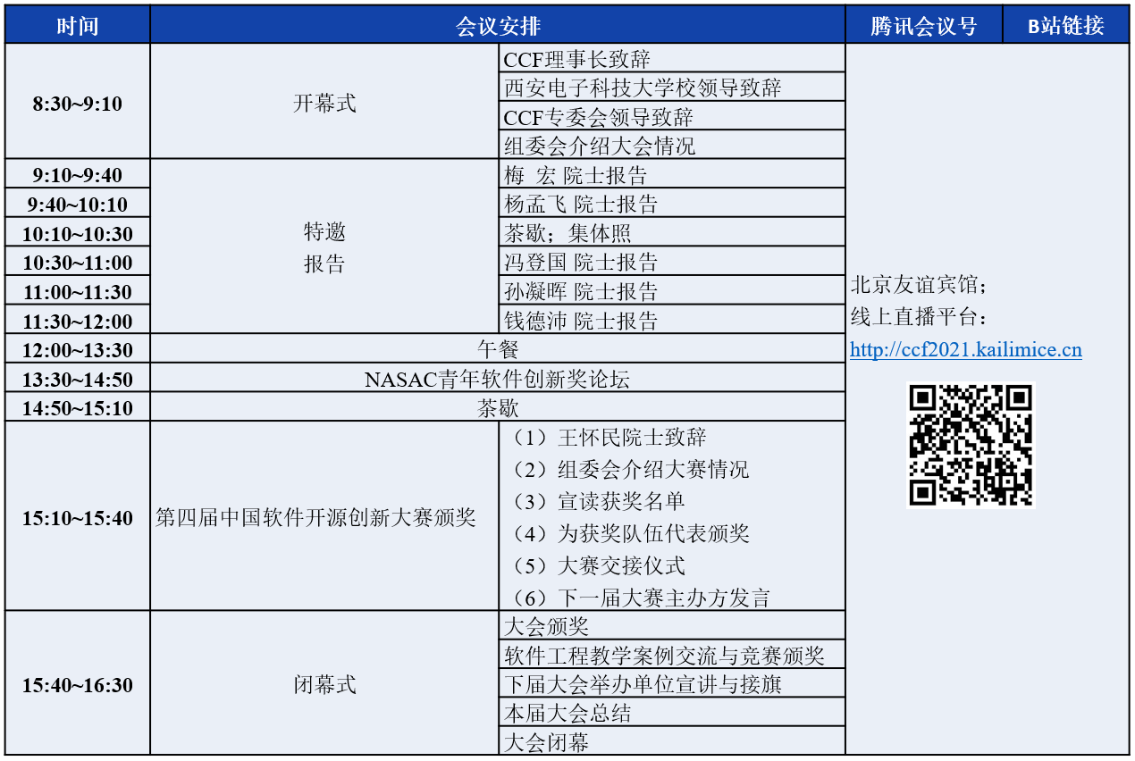 因会议举办地陕西省西安市出现多例新冠疫情本土病例,陕西省与西安市相继发布相关疫情防控政策。根据防控政策,西安市目前不允许召开线下会议或聚集性活动。大会组委会决定对本届CCF中国软件大会的举行方式进行调整。调整后的形式是,3天的大会活动安排为,12月24-25日通过线上的方式进行,所有分论坛都安排在这两天进行,12月26日在北京友谊宾馆设立线下会场,并同时通过线上直播平台全程直播,议程包括大会开幕式、院士特邀报告、NASAC青年创新奖报告、第四届软件开源创新大赛颁奖仪式、大会闭幕式等重要活动。