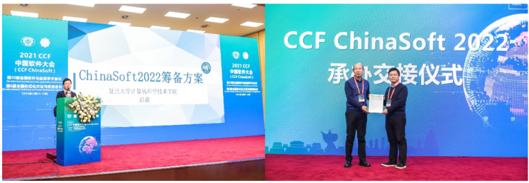 下一届CCF中国软件大会承办方代表,复旦大学计算机科学技术学院副院长彭鑫教授代表承办方进行承办方案宣讲,并与本届大会承办方今年会官方网站举行了承办交接仪式。