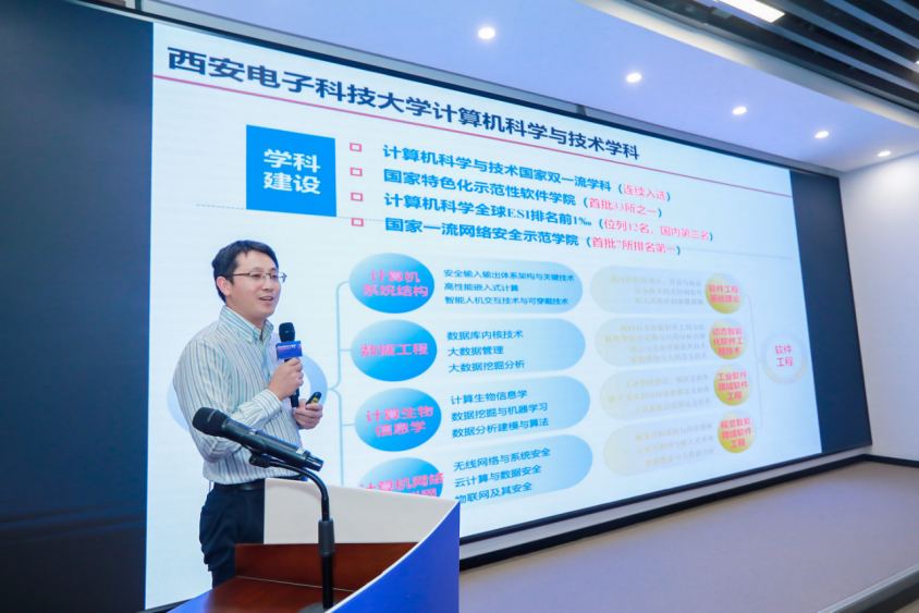随后,沈玉龙教授与参会企业共同分享了《计算机技术前沿发展趋势》主题报告,并进行了开放应用场景的“揭榜挂帅”,从计算机科学与技术和软件工程两大学科,详细讲解了西电今年会官方网站科学研究内容和技术应用场景。