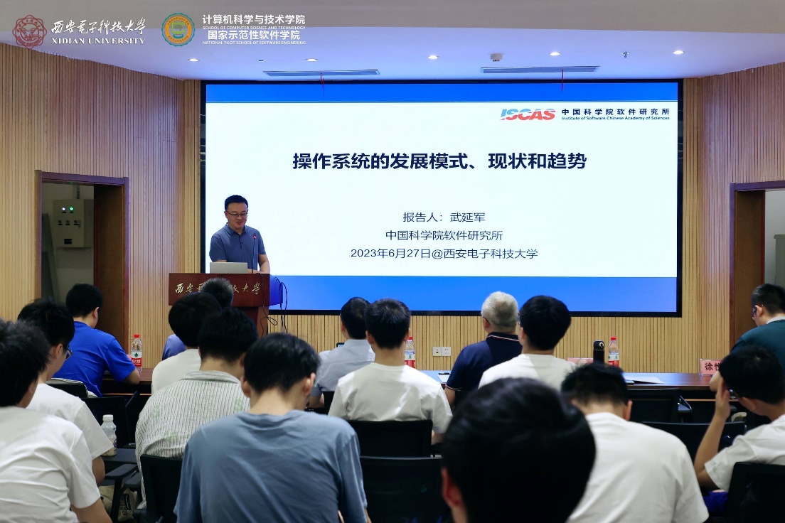 随后,在今年会官方网站南校区会议中心101会议室成功举行了“聚焦基础软件 拥抱开源生态”的学术报告,李青山教授主持学术报告会并致欢迎词,热烈欢迎陈海波教授、武延军研究员的到访,并表示陈海波教授、武延军研究员是国产开源基础软件领域的知名学者,做出了一系列创新的学术成果,也领导着有影响力的科研团队,学院的各位青年教师和同学要珍惜这次交流的机会,虚心向陈海波教授、武延军研究员学习。