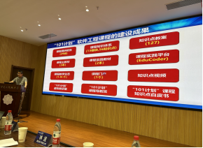 最后国防科技大学毛新军教授做了《软件工程教学生态的建设及应用》的报告,介绍了101计划软件工程课程所建设的3本教材,分享了依托三本教材所建设的教学生态,讨论了如何应用配套教学资源来开展课程教学。