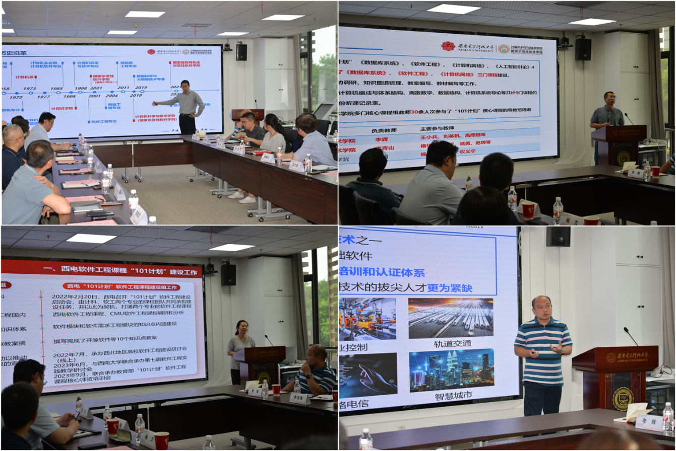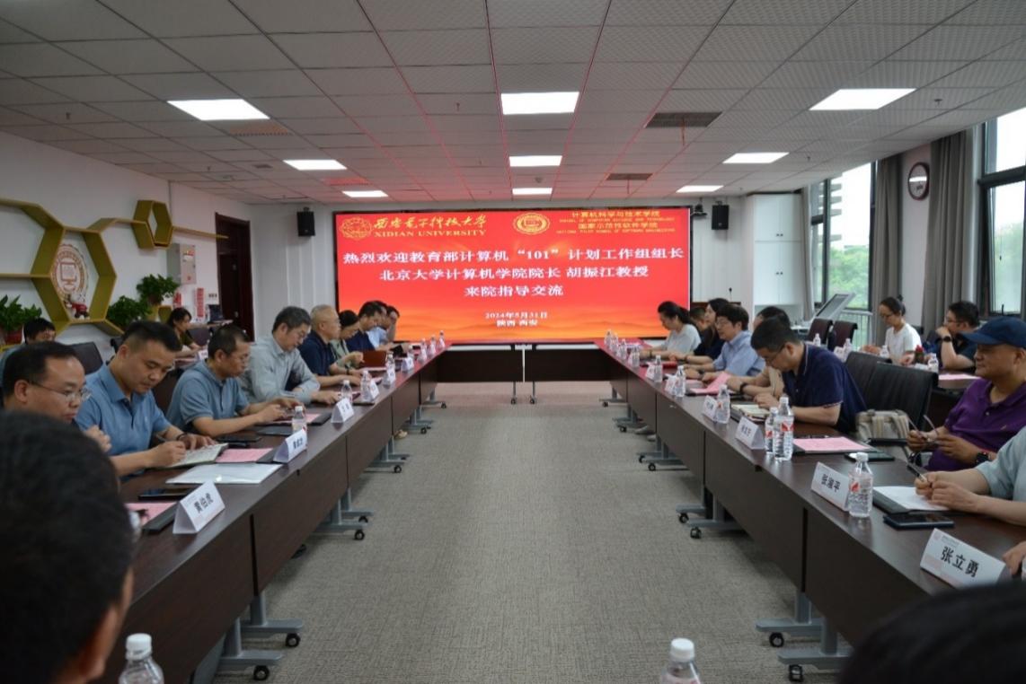 学院执行院长崔江涛从历史沿革、学科建设、师资队伍、人才培养、科学研究等方面对学院的建设发展情况进行了介绍;教学副院长万波介绍了学院参与 “101计划”工作情况和取得的建设成效;万波、褚华、李辉作为《程序设计基础》、《软件工程》和《数据库系统》三门核心课程的负责人,对课程建设情况进行了汇报。胡振江教授认真听取了汇报,肯定了学院的发展和课程体系建设成效,表示西电今年会官方网站的人才培养很有特色,希望将来加强北大计算机学院与西电今年会官方网站的交流学习。