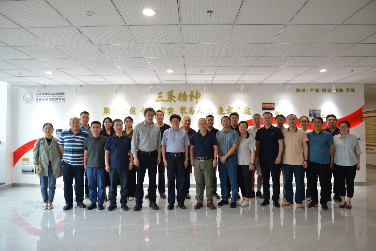 随后的交流研讨环节,学院教师与胡振江教授就课程建设、课堂质量提升、拔尖创新人才培养等问题进行了深入探讨,现场气氛热烈。最后,学院党委书记李青山对研讨会进行了总结,他谈到,学院后续将与北大计算机学院在课程建设、教师培养、人才引进等方面开展多维度、深层次的交流,促进双方共同发展。交流结束后,与会人员在学院“三系”文化墙前合影。