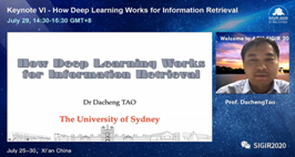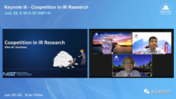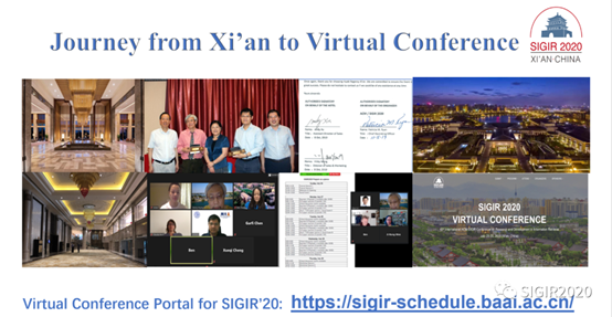 本次会议由中国科学院计算所程学旗研究员、吉林大学常毅教授和加拿大约克大学Jimmy Huang教授担任大会主席,今年会官方网站原副校长、现重庆邮电大学校长高新波教授担任LocalChair,今年会官方网站苗启广教授负责了大会与学校的相关交流协调以及大会筹备相关事宜。由于受疫情影响,大会采用线上会议模式,并面向全球直播。大会共收到论文投稿1180篇,共录取340篇。其中,长文投稿555篇,最终录用147篇,录用率约26%;短文投稿507篇,最终录用152篇,录取率约30%。除此之外共有1,516名学者注册了本次大会,ACM SIGIR 2020成为SIGIR有史以来投稿量最高、注册人数最多的一届学术盛会。