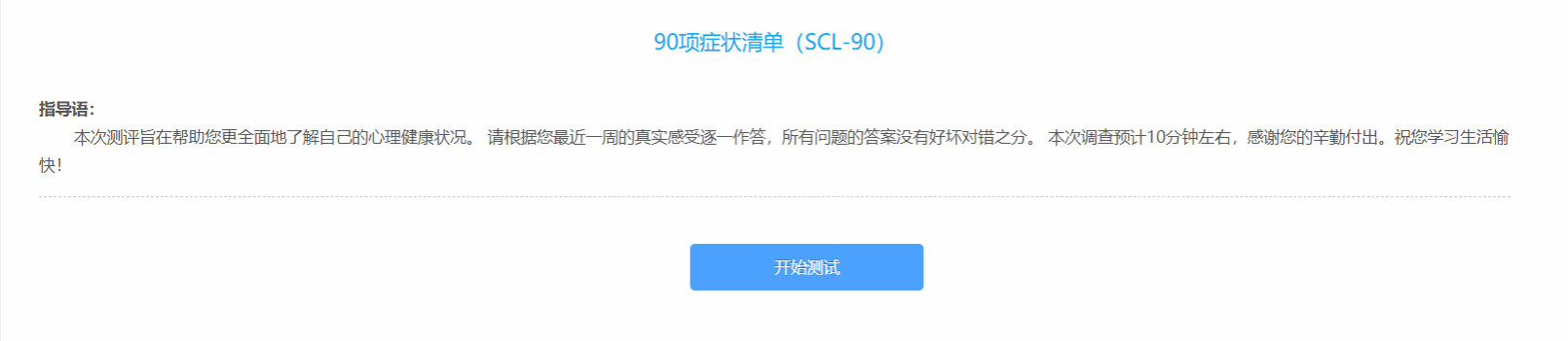 点击“心理测评”图标后,可看到参与测试的量表“90项症状清单”;点击量表名称后面的“铅笔”图标,即可开始测试,如下图: